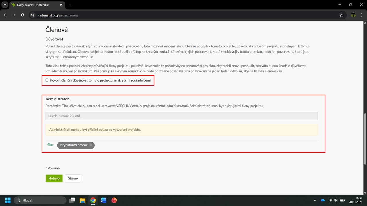 Po vytvoření projektu můžeme přidávat i další administrátory, ti se vždy musí k