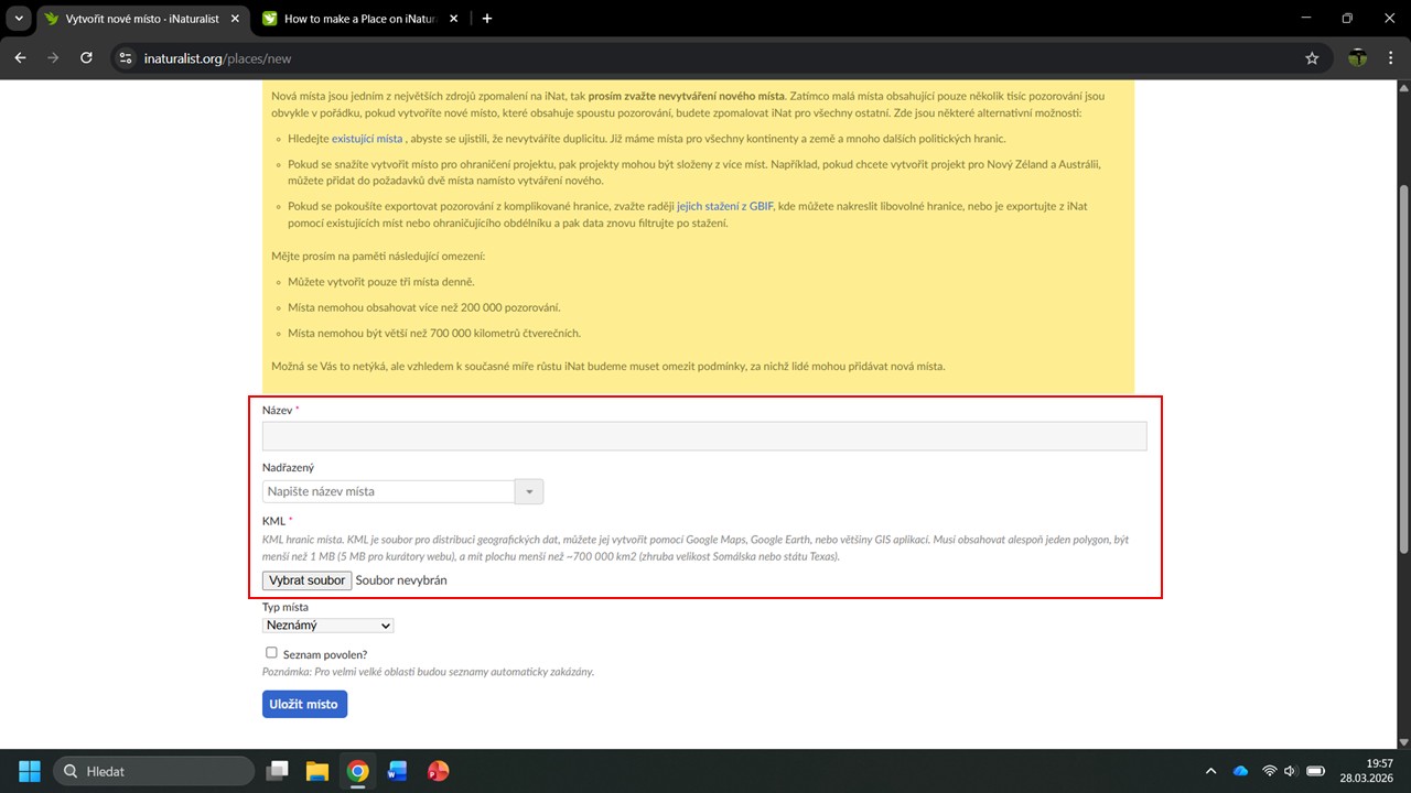 Pro přidání místa je nutné vyplnit Název
